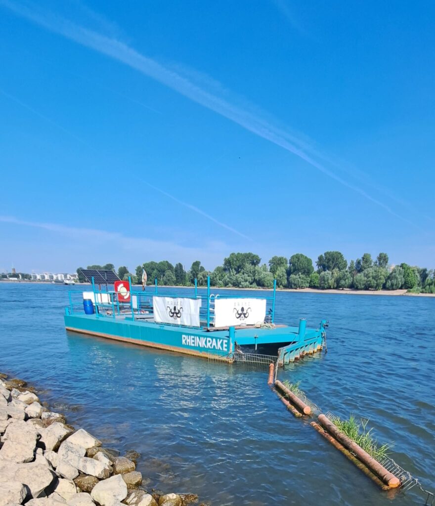 Seit 2022 ist die “RheinKrake” nördlich der Kölner Zoobrücke fest im Rhein installiert. Kai Hirsch, der technische Leiter des Projektes erklärt: “Die RheinKrake ist ein schwimmender Anleger bzw. eine Müllfalle mit einem nach vorne geöffneten Fangkorb. Der Fangkorb ist drei Meter breit und 80 Zentimeter tief. Damit wird ungefähr 1% der Flussbreite des Rheins in Köln abgedeckt. Ziel des Projekts rund um die RheinKrake ist es, schwimmenden Müll einzufangen, Daten über die Verschmutzung zu sammeln und das Bewusstsein für die Vermüllung bei Bürger:innen und Behörden zu stärken.”